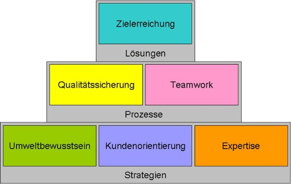 Der zentrale Baustein unserer Philosophie ist die Erreichung der Ziele unserer Kunden. die sich auf Basis der Strategie über die Prozesse in individuellen und ressourceneffizienten Lösungen manifestieren.